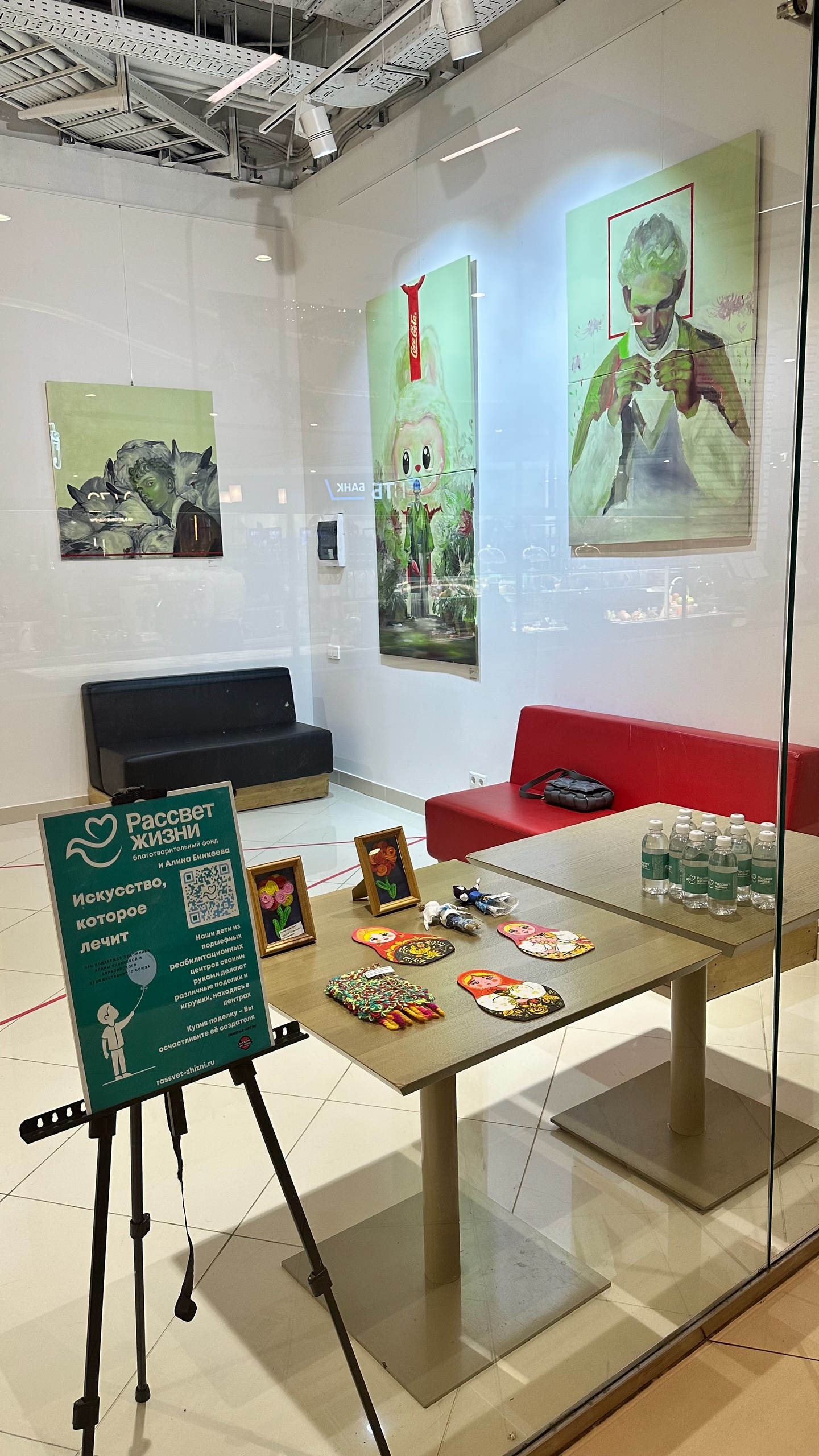 Алина представила свою новую коллекцию картин «Игрушки» — глубокую, ностальгическую и очень личную. А «Рассвет Жизни» добавил в её выставку частичку души наших подопечных. Рядом с профессиональными работами теперь живут самые настоящие, искренние произведения — поделки детей из наших подшефных медицинских реабилитационных центров.